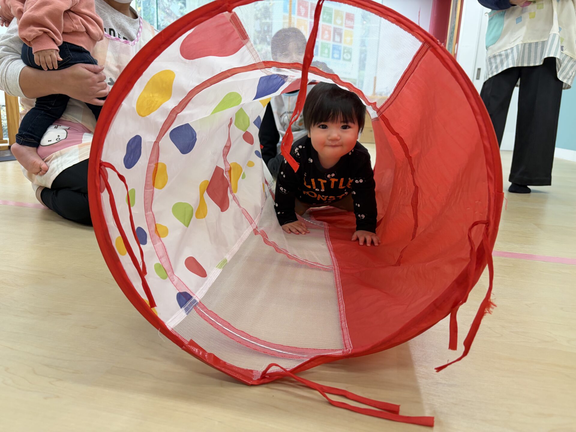 先生たちが声をかけるとハイハイで中に入り、布が揺れる感触や、トンネルの中から見える景色を楽しみながら、にこにこ笑顔でくぐる姿が見られました😊